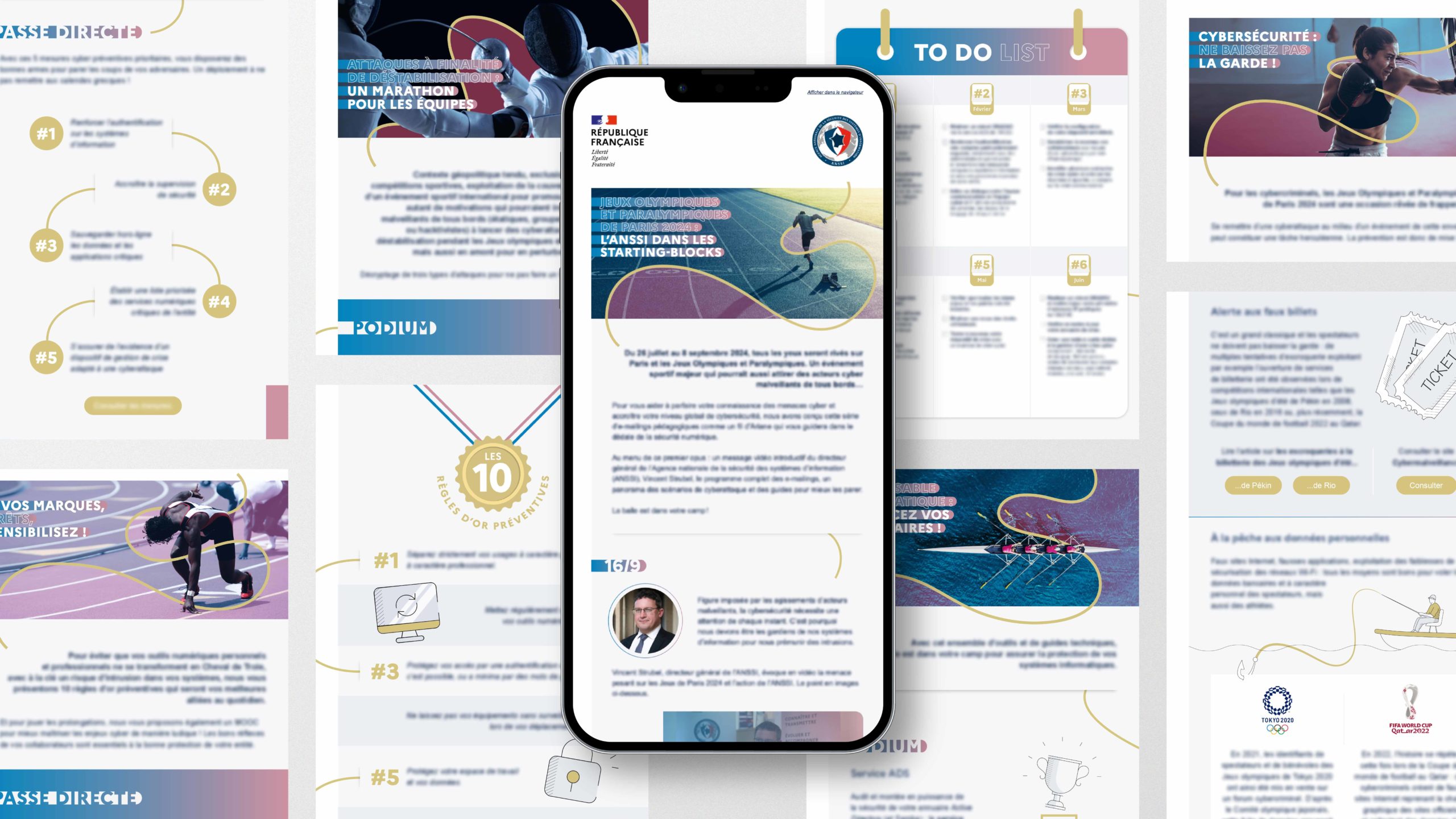 Nous avons initialement élaboré une direction artistique complète combinant l’identité visuelle de L’ANSSI aux codes graphiques des Jeux pour la réalisation d’une série de 10 e-mailings couvrant des thématiques variées.